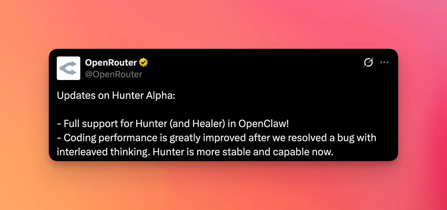 Hunter Alpha also hit a known bug at launch. OpenRouter confirmed an issue with interleaved thinking that was degrading its coding performance. A fix was deployed, with OpenRouter describing the model as "more stable and capable" post-patch.